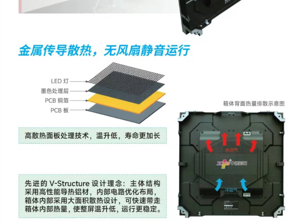 先進(jìn)的V-Structure設(shè)計(jì)理念:主體結(jié)構(gòu)采用高性能導(dǎo)熱鋁材,內(nèi)部電路優(yōu)化布局,箱體內(nèi)部采用大面積散熱設(shè)計(jì),可快速帶走箱體內(nèi)部熱量,使整屏溫升低,運(yùn)行更穩(wěn)定。